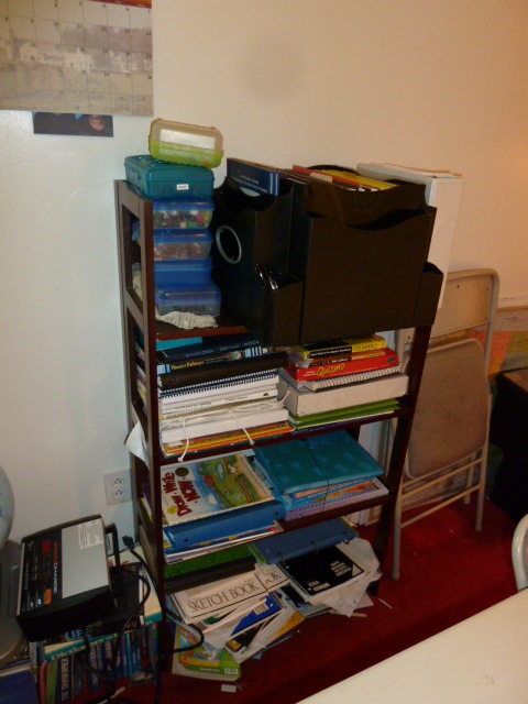 So I tried putting it on the “homeschool work” shelf. It hangs over by a few inches.