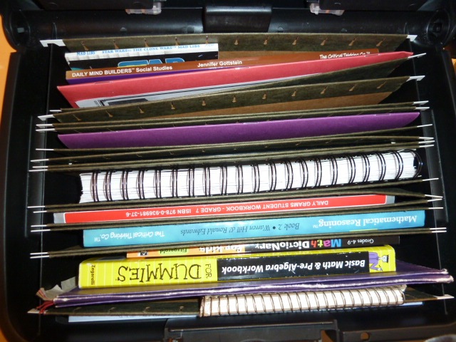 Ah Much Better. For the record – we’ve only done “school” here about 5 times. So now, it’s the Library, instead of the Classroom. For those looking for Workbox Ideas for Older Kids – High School and Middle School – I have this handy book shelf on the left to store this year’s products on. Each little pile is a subject. The resources that I want to use for the month go into the workbox. They are old enough to “do the next page”. I do use the white board and a sticky post it system if they need lists for the topics of the day. I enter everything on this shelf into the Resources on Homeschool Tracker – and play around with how our day/week/month might look.