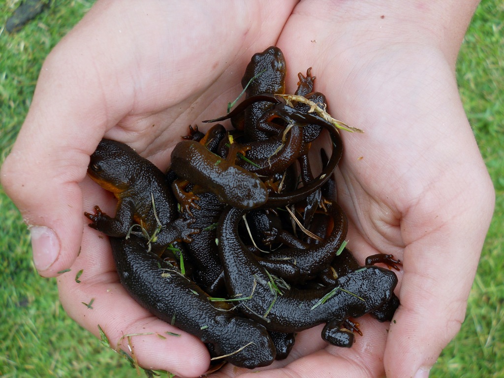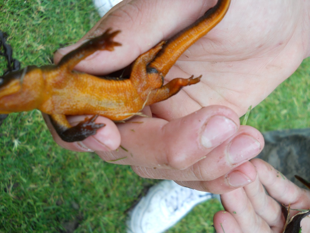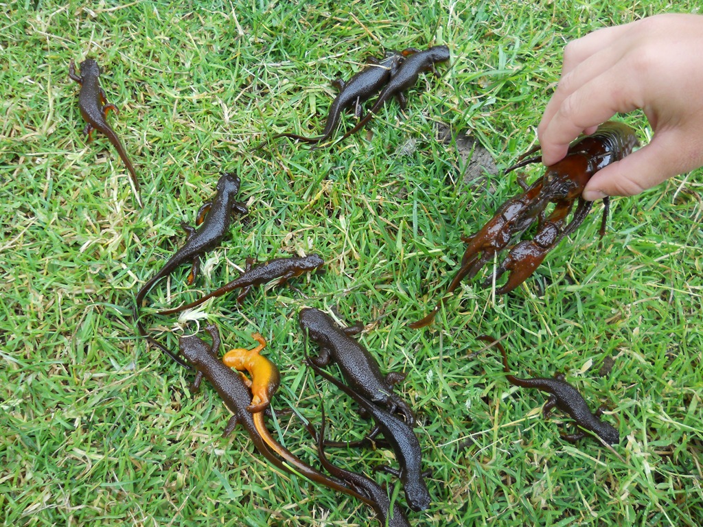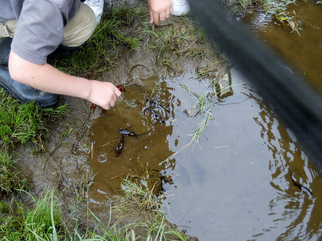 They called a couple of times eager for me to come see what they had discovered – that the newts hide in the grass along the most shallow of the water here. When they walked up to the puddle near the pond – they saw one newt scurry into the grass. , soon, they discovered that all of the grass clumps were “shadowy” (I love their latin scientific terms). Once they figured out how to find them, they each had a handful. There are 12 above in Nate’s hands. This puddle is attached to the larger pond – so they could live anywhere along the edges.