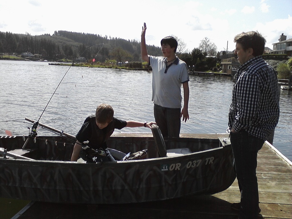 Buying a new boat . . . . Not sure what Nate is doing. Vowing to always wear a life vest and give his brother turns driving?