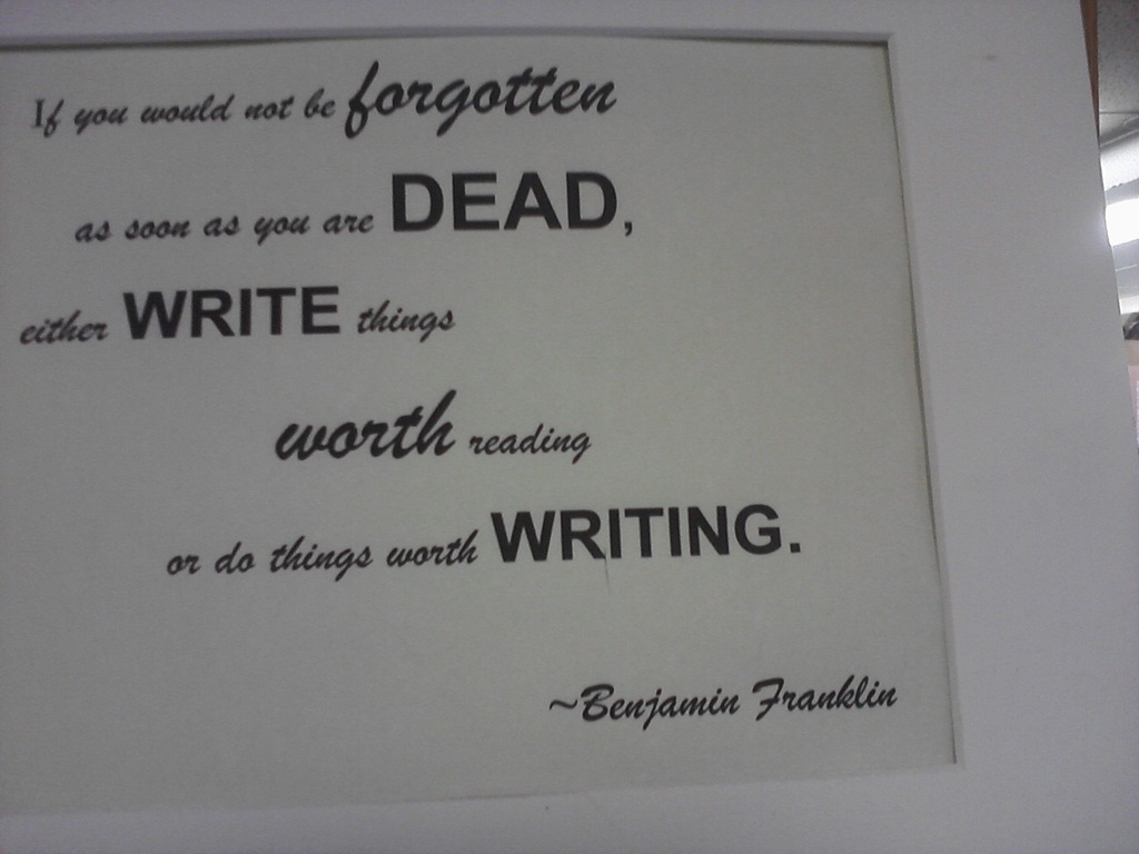 If you would not be forgotten as soon as you are dead, either write things worth reading or do things worth writing. Benjamin Franklin. This is a sign in our local Driftwood Public Library.