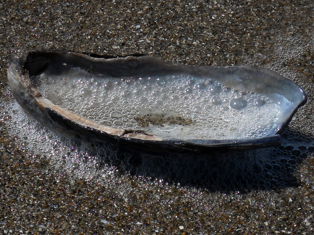 This Should be a beautiful multi colored photo of the iridescent muscle shell with the bubbles each evenly reflecting the pink, green, blue and purple colors. Alas, with my broken-ish Nikon L22 – this is all ya get. I wrote to Panasonic Lumix today to ask to be a product tester for their DMC TS2 water/sand/dust/freezing/angie Proof camera. I hope they say yes. Counting it up today, I’ve lost 6 cameras since 1998 to Water damage. 3 were Lumix, 2 Cannons, 1 Nikon.   Lumix by far is my favorite.