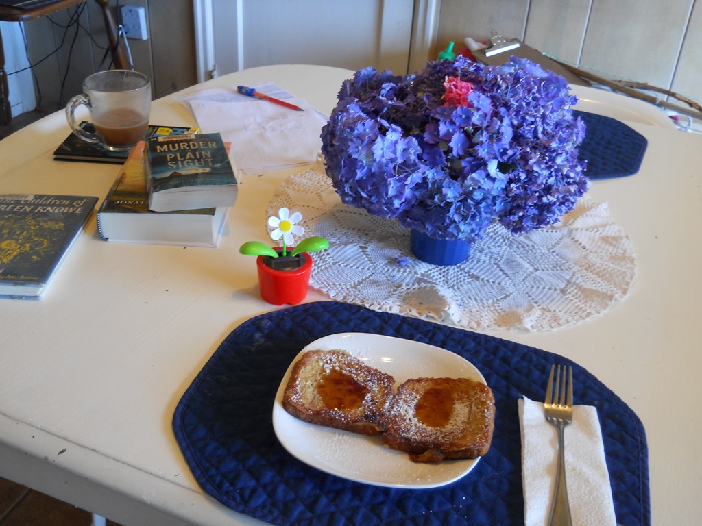 This morning’s photos – Books for this weekend, french toast made by Jon, flowers I picked yesterday, and hot cocoa. ![]()