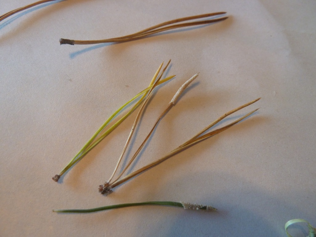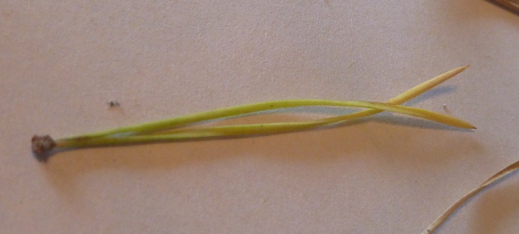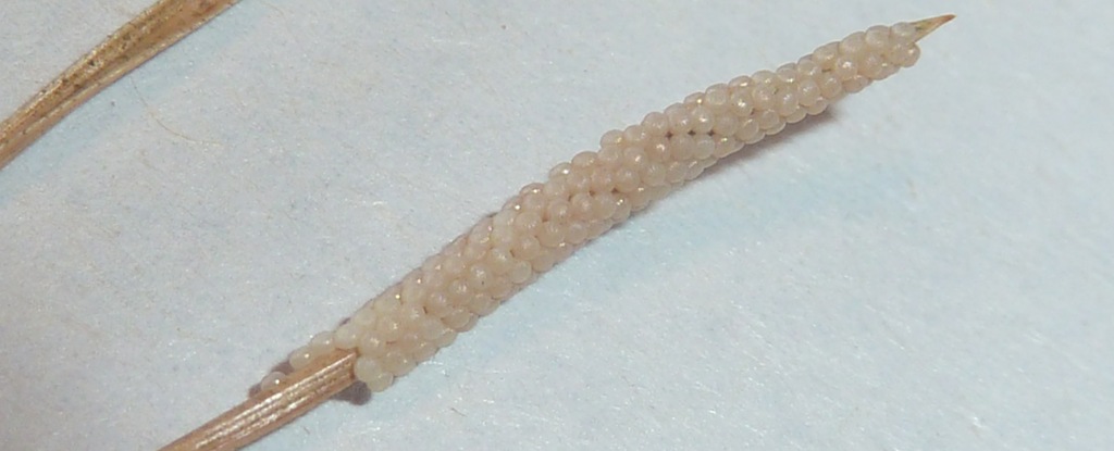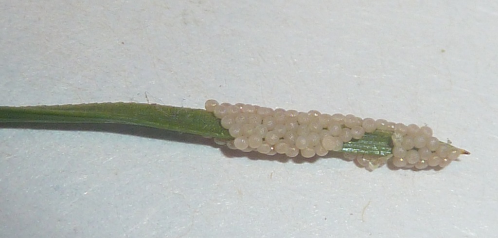 There is one lone pine tree on her property – and I noticed the needles that were yellowed on the tip. I didn’t see any leaf miners – but I did see what was described – and found these cool eggs on a few of them.
