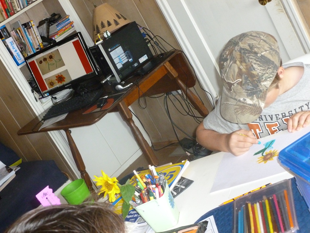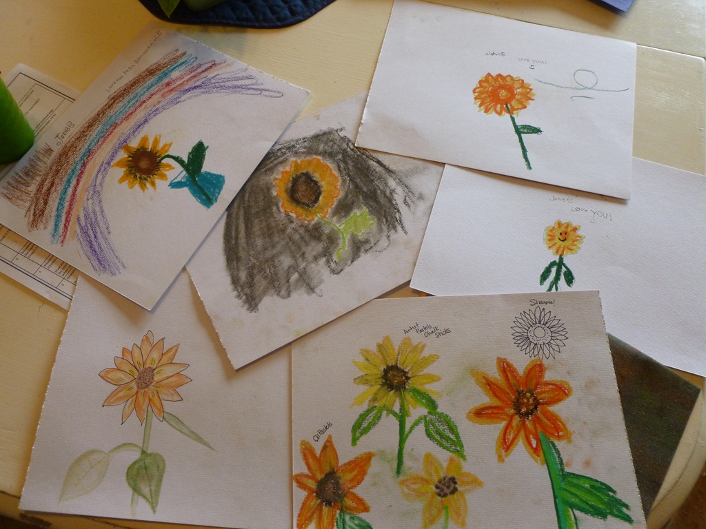 Picking a sunflower from the yard to use as a point of reference helped our drawing.  For all of our drawings, the one based on the flower in front of us looked the most real. Go Figure. Over a year of Nature Observation paired with the drawing lessons – Woot!