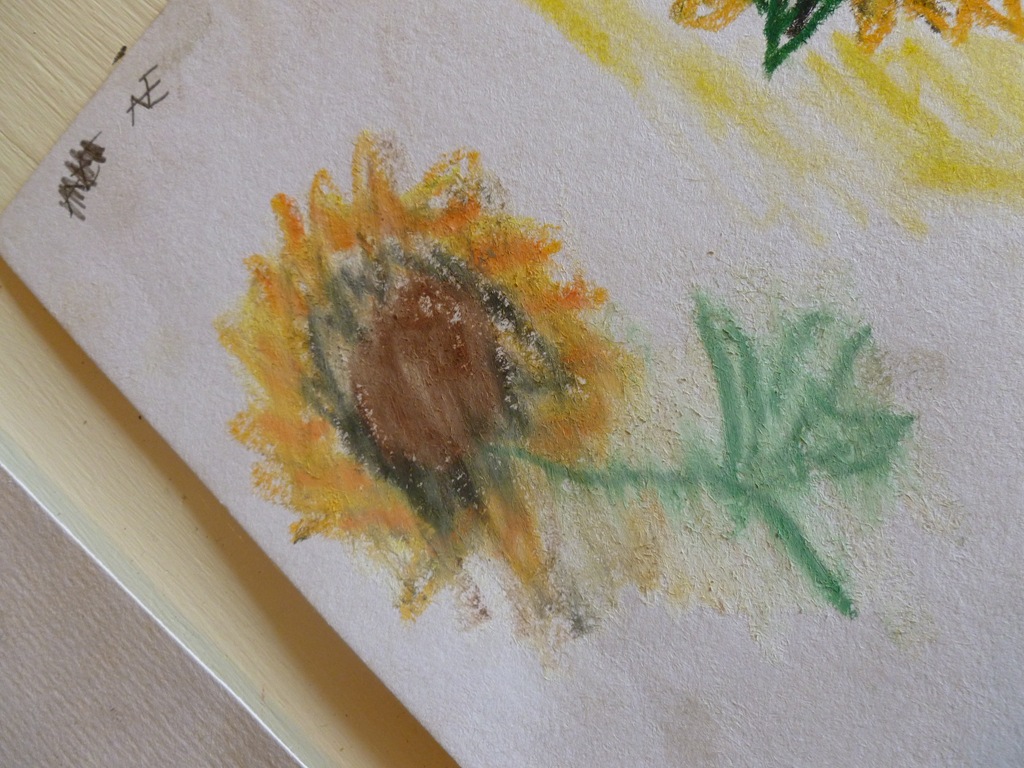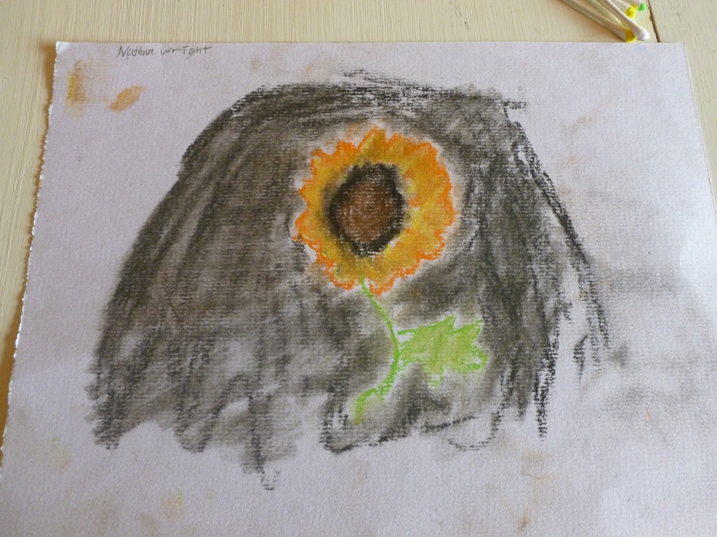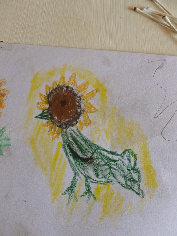 Nathan the Funny Man.  Dark Sunflower. Foggy Sunflower. Chicken Sunflower.  He’s a funny funny boy. (One of the lessons in Drawing with Children is to turn a mistake into part of the picture – or change the picture.. . .)