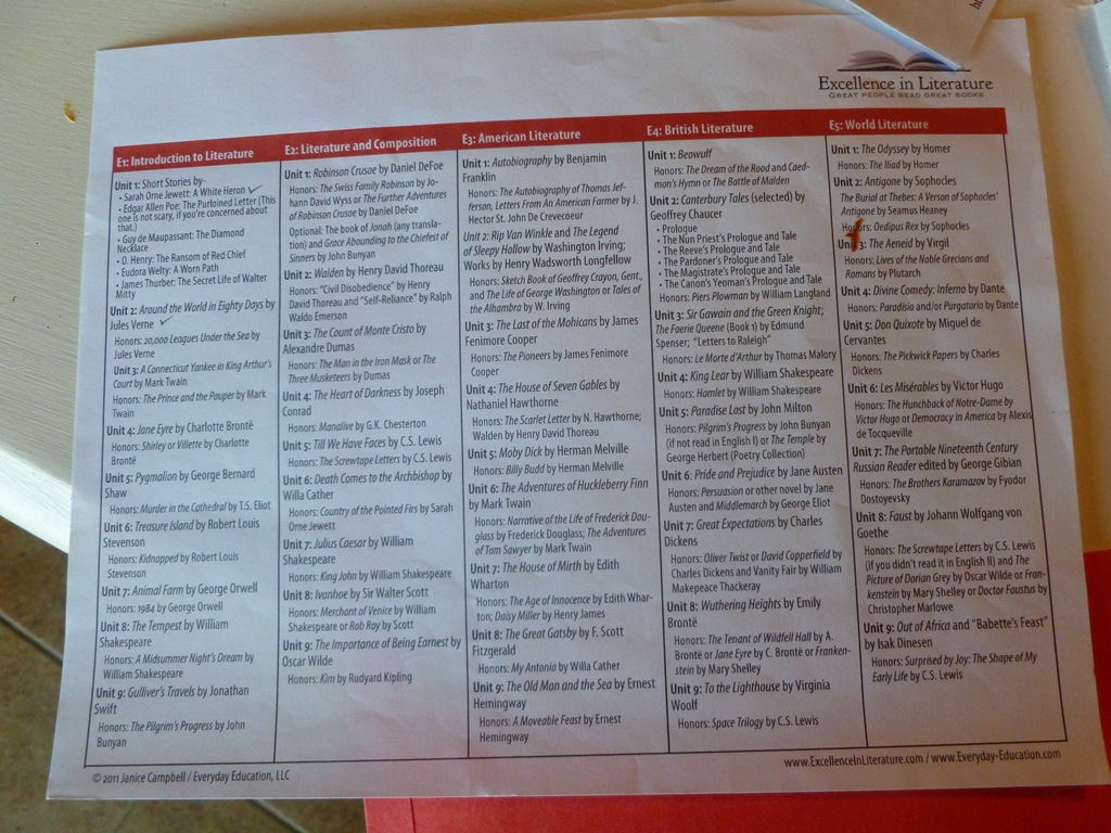 She also must understand my Big Picture brain, as her information wasn’t tailored to this one year’s of text, but to the entire study, all five years worth. She created a very easy to read guide of all of the unit texts from E1 to E5. Introduction to Literature, Literature and Composition, American Literature, British Literature and World Literature. Although she provides several links to free downloads, MP3’s and even some videos – I have been taking the list to any used book stores I go to to ask if they have one. I think it would make for an excellent bookshelf!