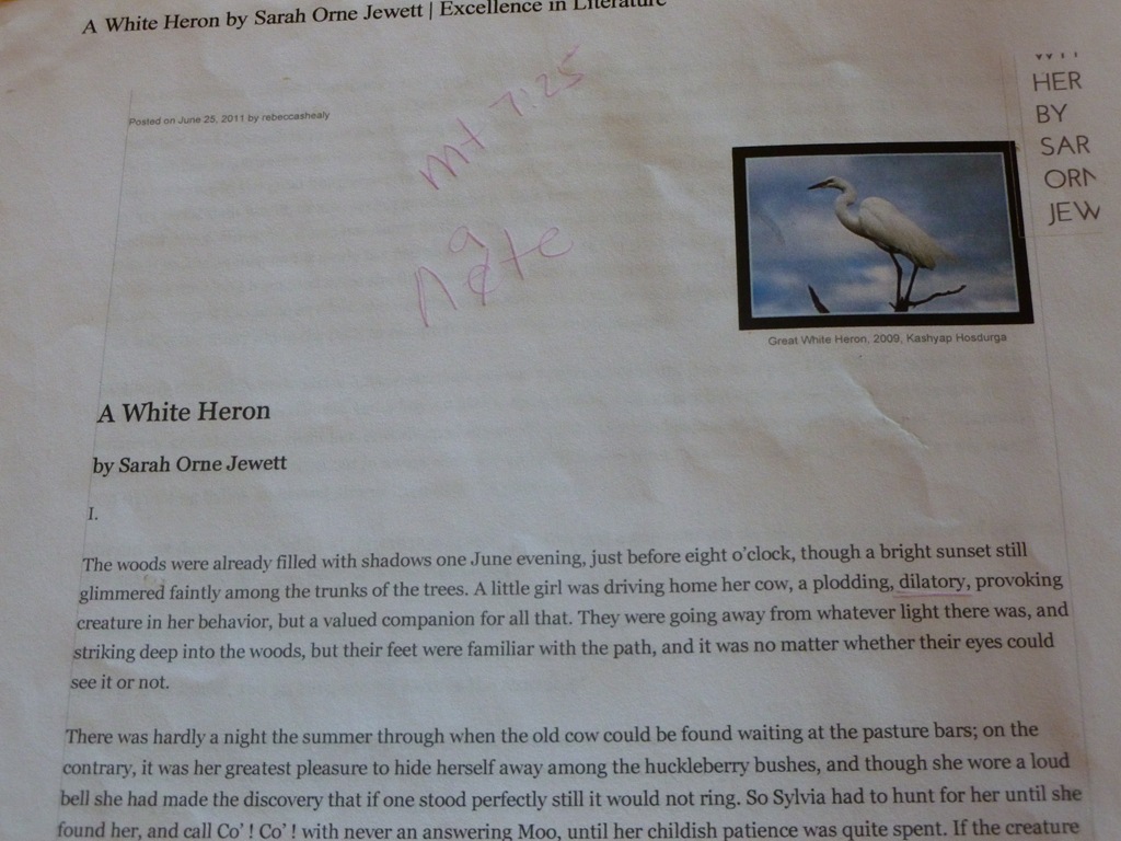 So for the past few weeks, we did a little bit out of Unit 1, and then Nate wanted to jump to Unit 2. We both really enjoyed A White Heron by Sarah Orne Jewett. It was fun to learn to write an approach paper; she gives very simple instructions and examples. I really enjoyed Nate’s narration back to me of the entire story. I could tell that he really enjoyed the details of it, and was surprised as I at the ending. We were both glad for how it turned out!