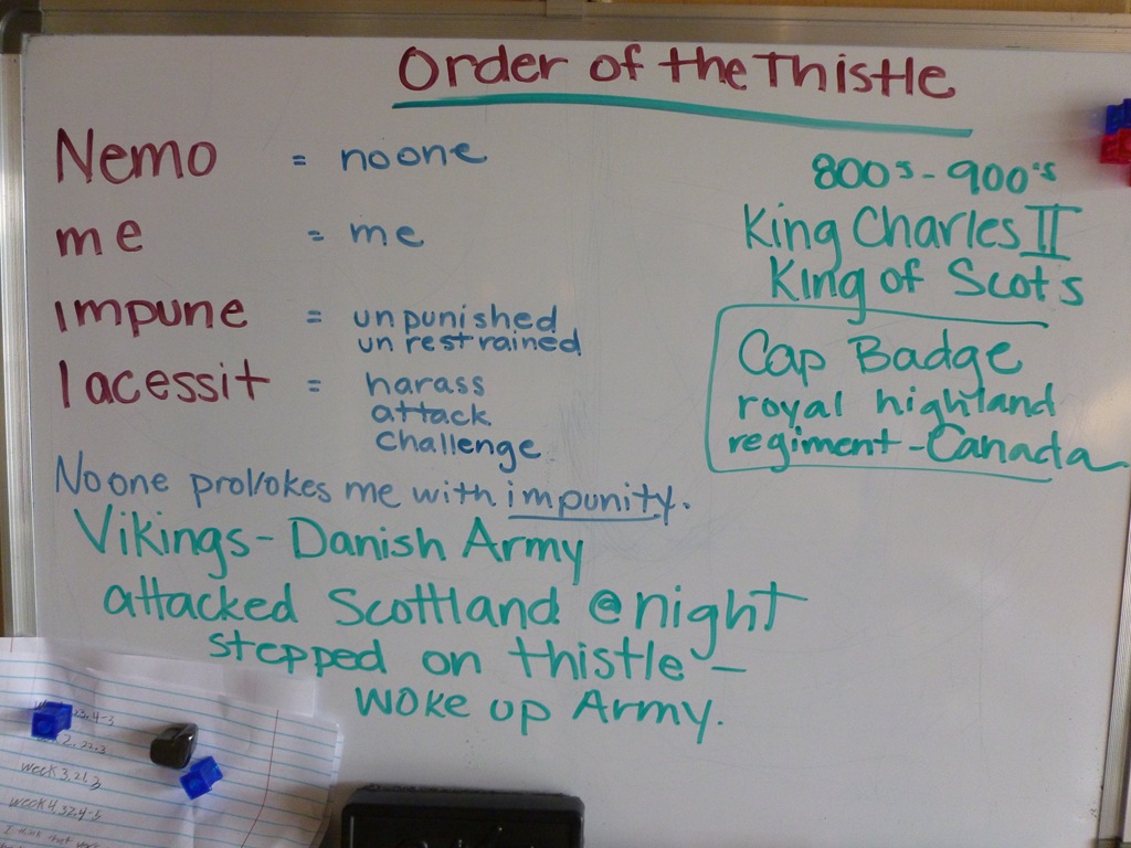 Apparently the Order of the Thistle, and a Motto for Scotland is – Nemo Me Impune Lacessit, which translates – Noone Provokes me with Impunity. Impunity? What is that? Why wouldn’t you want to be provoked with it? We looked up the Latin words and learned that impunity meant that you wouldn’t let anyone attack you and let them go unpunished, or allow them to attack you without restraint. The plant book talked of the Danish Army attacking Scotland at night, when a Viking stepped on a Thistle and cried out, alerting the Scottish Army. The Thistle became known as the Protector of the Scottish Army.
