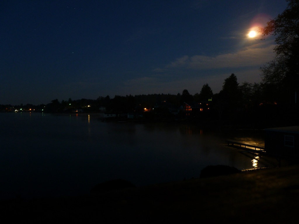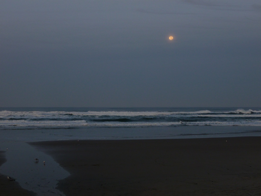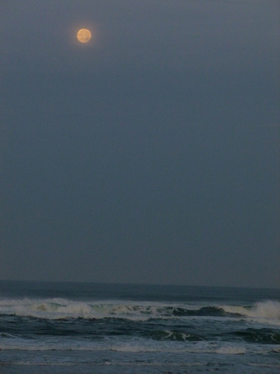 The moon, setting over the Ocean, stopping for a moment to light up the Lake – my view from our coffee pot at the Mil-Mar. You can’t see the extra mile of water line with houses lit up like little twinkling stars, evidence of a Veteran’s Holiday weekend starting early. Beautiful.