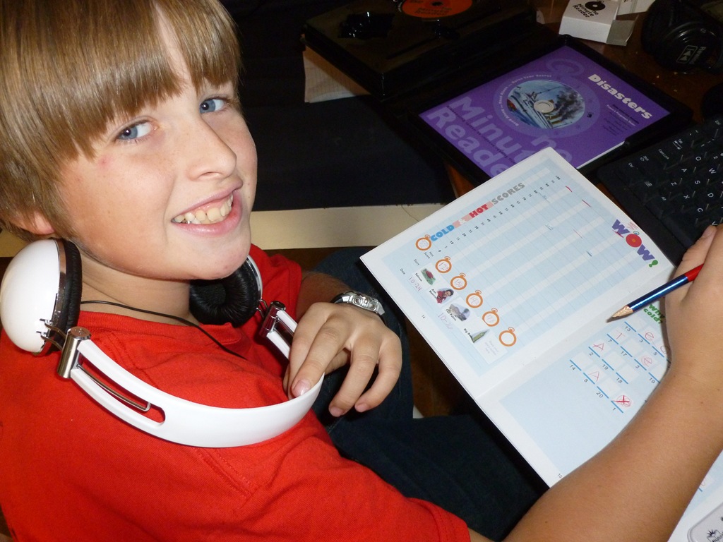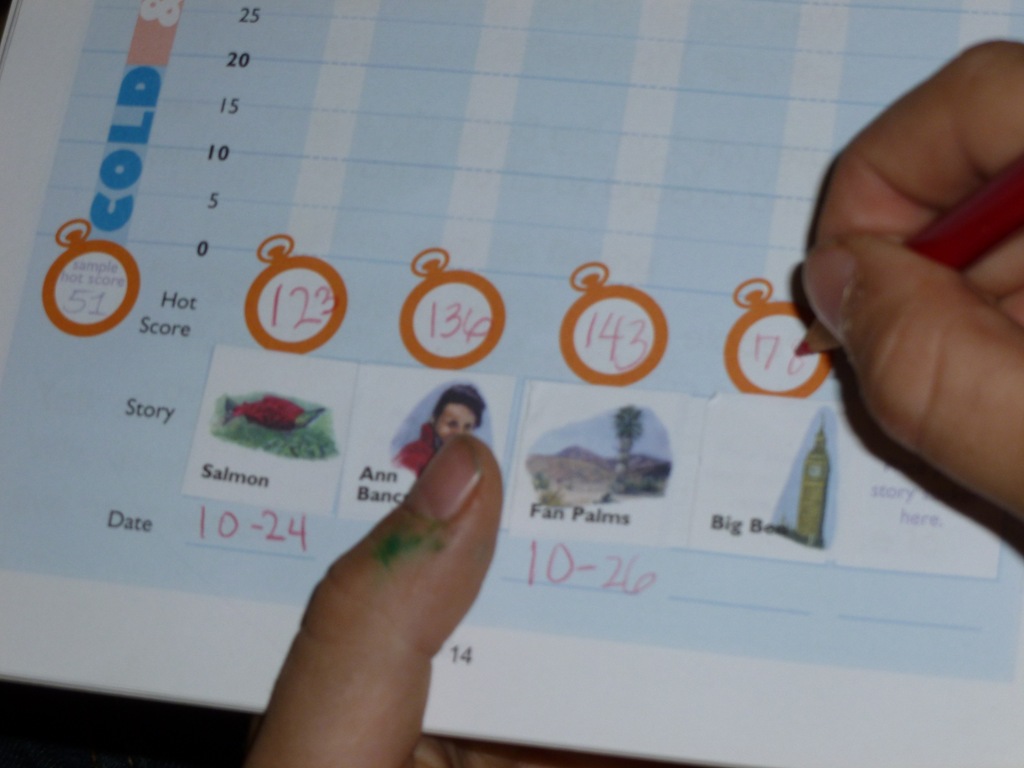 Next, he reads the story along with a teacher on the CD. I could have downloaded the stories to the iPod, but we are still having issues with the software upgrades, so the computer worked for us. He reads it aloud with her 3-4 times, then reads it again with the One Minute Timer, and marks his score again, this time in Red – the Hot Score. Each time, without fail, he practically doubled his reading speed. He’d jump up to 120-140 wpm in a few short minutes.
