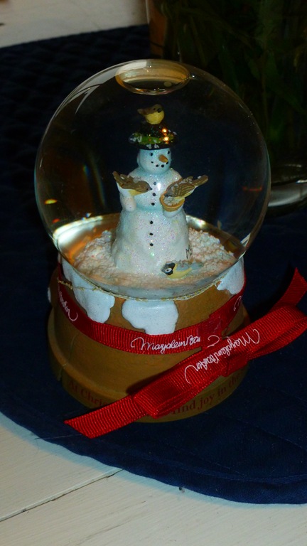 Yesterday after pie and before the board games (10 Days in the USA & Europe and Blokus) I got out our holiday activities. First comes the bird lovin’ snowman. I love this snow globe.