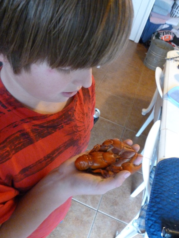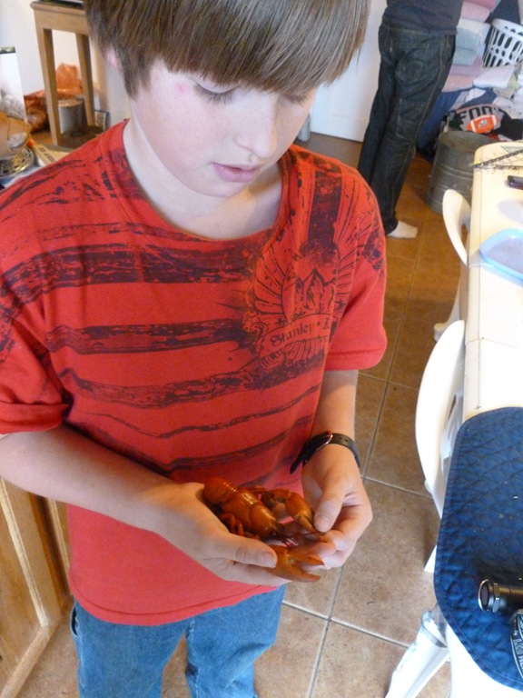 He brings in his catch and takes up valuable real estate on the electric stove, creating a great crawfish boil for his little snack. He eats the WHOLE thing. barely spits out the bones. Weird kid.