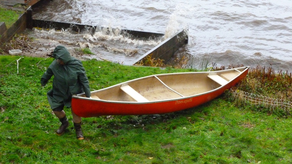 Wearing my flashy post pie flannel pj bottoms hiked up to the knee, I get all geared up to move the canoe while my dining friend Ms. Randy clicks photos from the deck.