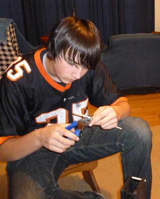 A reminder from the company – “These products are intended to be used with parental (or adult) supervision. These products are not marketed as toys, and are not intended to be used as such. They are meant to be used as educational tools (and the learning is lost if a child is left to his/her own devices).” You may notice from the photos that Nathan is doing well with the assembly, but Jon is watching TV and sketching. Nate was interested in the math, measuring, and building, and we had some great conversations during these days, and now in the future. Jon made a giant straw out of the extra parts. Had Jon, the ten year old, been the child this project was focused on, I would have been much more of a helper and instructor to him, introducing him to the measurements, cutting, and engineering.