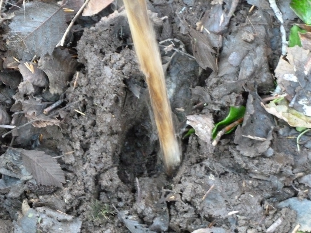 TaDa! he found it, on the other side of this clump of bushes, the dirt is caved out, and it washed into that little cave. Wonder if it is an animal hole for the lake otter?