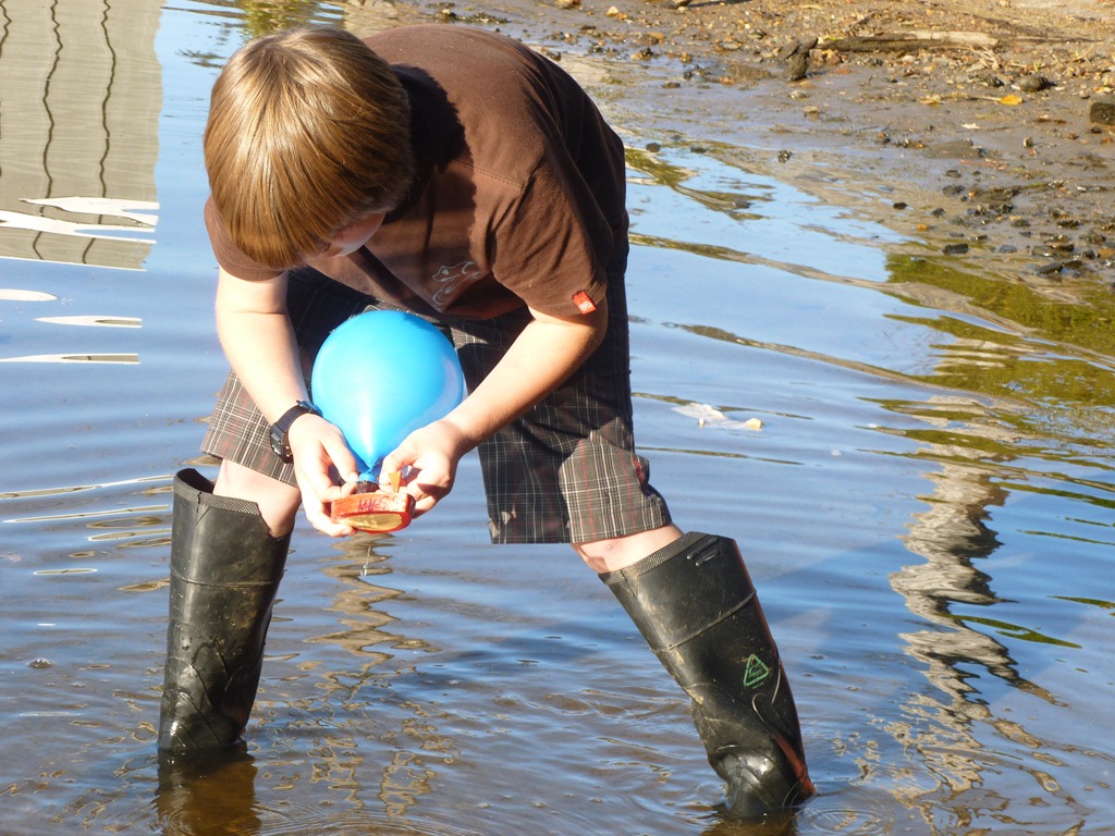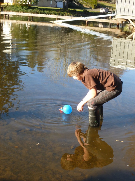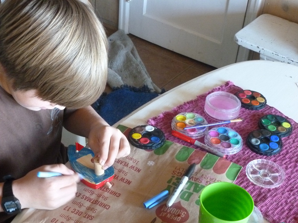 Jon recently spotted this little boat during a trip to Newport and wanted to try it out. He set out to paint it, and as usual, I had no idea what he was doing. He was calling from the other room – “How do you get the paint to stick?” “It should”, I reply, “Let it dry and then it will stick to each layer, but it might slide off in the water”. He asks if he should just use sharpies instead, so I said sure. I felt sorta bad when I came into the dining room and saw him trying with my nature trail watercolor discs, instead of the box of tempera or acrylics I thought he was using.