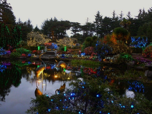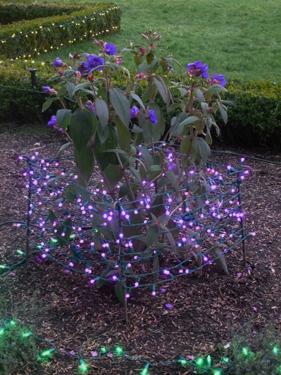 A beautiful still pond waits at the south end of the garden. Reflection of the lights is indescribable.  We would sit on these rocks and watch the pond for an hour when they were little. Volunteers start winding these lights around every bush, over 300,000 lights – until Thanksgiving. The public may walk through until the New Year.