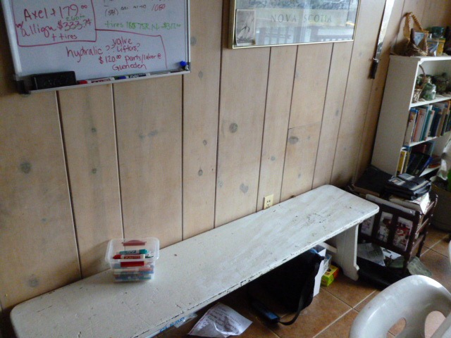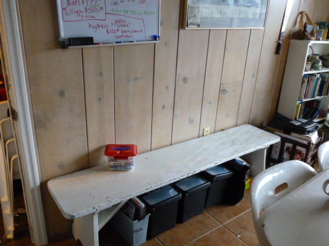 For those of you who visit – you’ve seen this lil bench in all sorts of disarray. On a perfect OCD day – there would be neatly stacked up workboxes beneath, with nice light blue checkered cushions on top, with a neatly stacked field guide / nature display shelf to the right and my reading books . . . ok. That really only exists in my brain – we pile all sorts of things on this bench, hidden by the kitchen table. . . . .