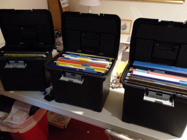 I have piles on my bookshelves for each type of topic, Math, Writing, Latin, Art, Geography, Science, etc. I just put the books on top of the matching pile. Today, I went through their workboxes as well and pulled everything out. In the afternoon I went to the local mart and purchased some more file folder holders – then went to good will and picked up 20 for a buck. The box will be headed back to the Mart today . . . .