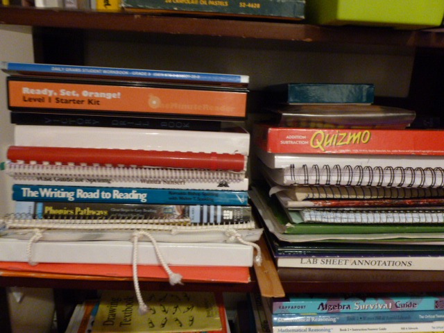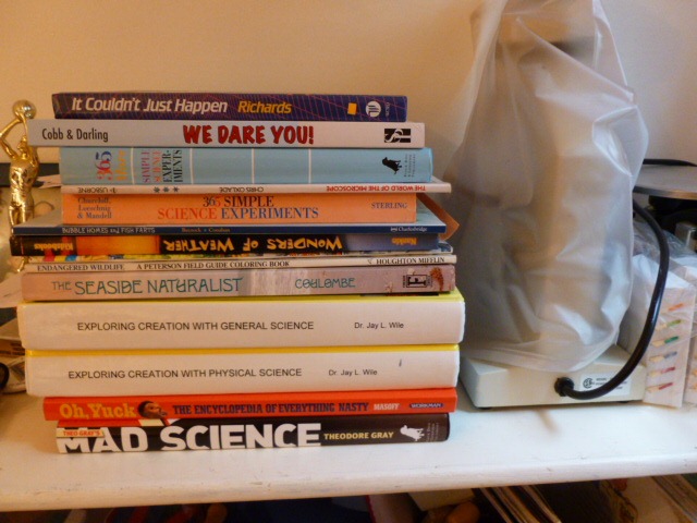 In fact – each year, I have looked at the grade level of Science Scope and Sequence, or actual text – and we have already completed those requirements. Even this year, with General Science and Physical Science – the only thing lacking was a detailed study of the human body. – Looking at this shot – I really need to find someone who wants my President books and may be interested in some Latin Curriculums. . . Anyone?