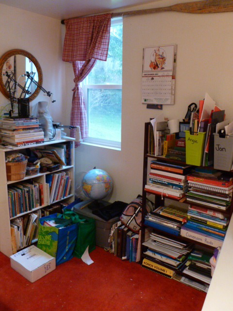 As you can see – I’m not into neat as a pin, stacked perfectly, presentation. We cull from these shelves to help our studies. Rarely do we “do” school in here, I will come in here for quiet crafting time, or planning. Jon comes out here quite a bit to play with his crafts – he is really into the glue gun, popsicle sticks, paper crafts, etc. I never know what the table will look like when I enter this room!