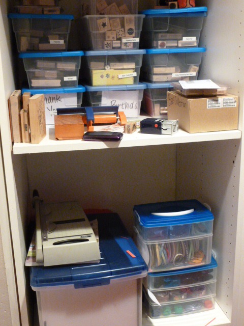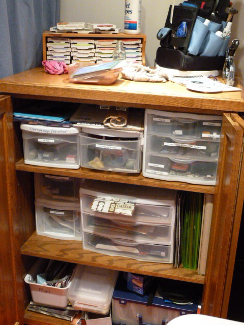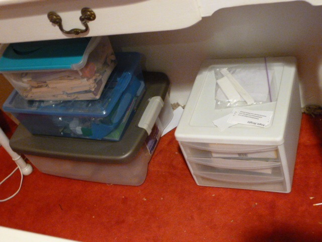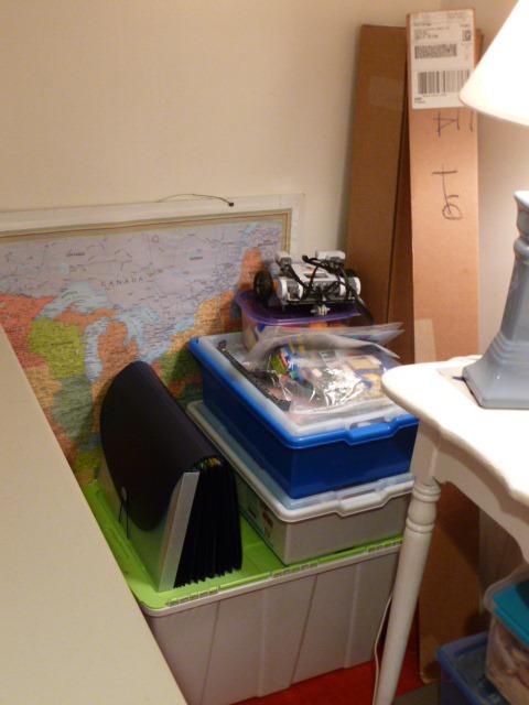 My craft corner – Buckets of Stamps and Card making supplies, a used entertainment center found at a garage sale, on wheels house my art supplies with closing doors, a pile for our Lego Robotics supplies, and Jon’s tupperwares of crafts. He has free open permission do what he wishes with his glue gun, paints, wood burner, etc, he has mats and plywood boards to work on. I keep everything in gallon ziplocks, he’s pretty good at putting them back in the containers.