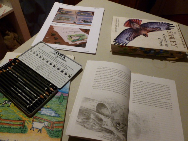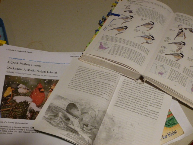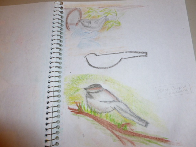 And in the end, we spent an hour or so out in the craft room, chatting and giggling, creating silly pictures. Everyone participated. Since we are studying Chickadees with our Handbook of Nature Study – Winter series, I didn’t stress any field guide work. Since we are on a break from our Artist Studies, I didn’t require them to try to learn a new skill or create the work to a rubric. It was just fun open drawing – with a focus or starting point – with the black capped Chickadee.