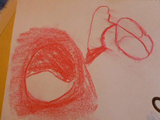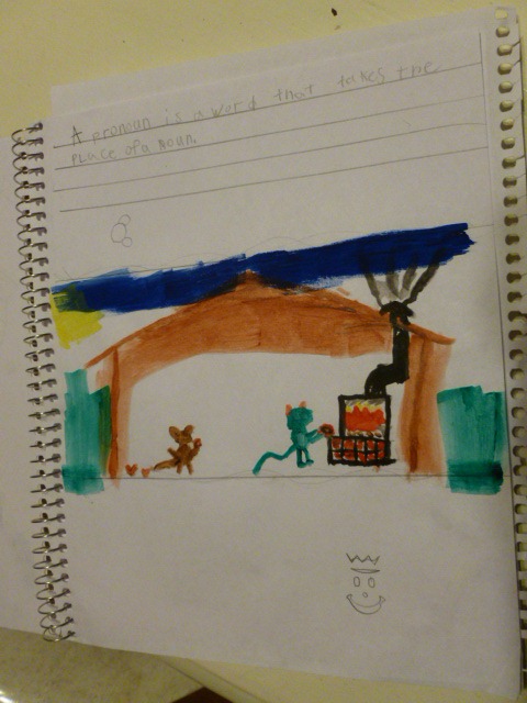 And while I have your attention – I’m just going to have them work in one spiral for notebooking. We’ll keep the pattern of Bible, Geography, Music, Art and Nature. I’ll either just keep them by date, or cut out the pages and separate them into a sheet protectors – but like I said in my last post, I don’t think I need the beads to all be the same color pattern . . . On the left, Jon wrote about his grammar lesson, and then drew a story about The Monkey, the Cat and the Chestnut. What we learned? None of us can draw a monkey – unless monkeys look like mice.
