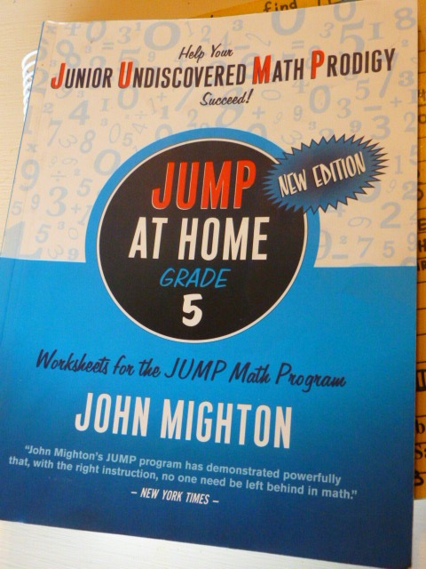 Jump Math 5 for Jonathan.  Junior Undiscovered Math Prodigy.  Jon worked his way through all of the Miquon materials, then spent last year along with brother using many products from reviews. He ran into HUGE frustrations with fractions. Every day tears and crying, Jon did well, but I couldn’t handle it. ah!  We stopped in November and started memorizing Multiplication Tables – Then worked through some more review opportunities – until this year starting Jump Math 5. Wow. What a difference. He actually writes FUN at the top of each page. We do two pages a day. We will continue with the program until he is ready for Teaching Textbooks Algebra – well, we’ll probably take a break in 8th grade to do Mathematical Reasoning as well, or um, also.
