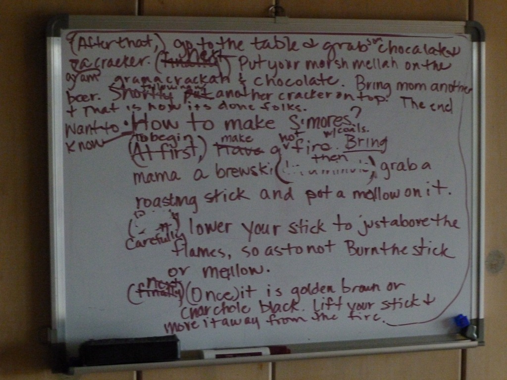 We started with Nate’s title – How to make Smores. You can see that he later changed the title to be a sentence – Do you want to know how to make a Smore? The boys took turns with the instructions, Nathan went through the Order Words List to start the sentences. After completing the story, we went through and tried to think of other order words, that might make the paragraph flow more smoothly.