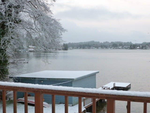Hey – as a side note, I don’t think I’ve shown this view of the house before. Note the space between the house and the hedge? The hedge is over my head? Under the deck is the only “garden” space we have. . . .The sun has about 1 hour to hit it each day in the afternoon – we are working on gardening ideas for next year. I give up trying to grow veggies down there. However, our property owners have done an amazing job of filling the space with low maint beautiful plants. . . . um, on with the snow. . . . .(must be seed catalog time when a girl can look at a snow picture and picture zucchinis.)