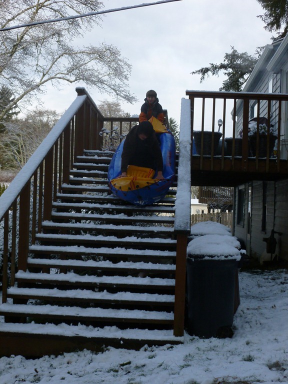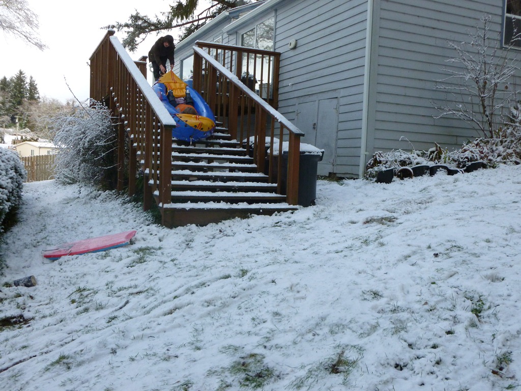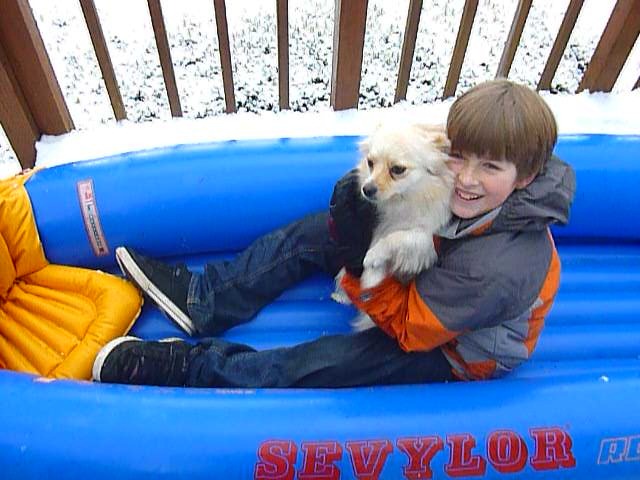 Brave Jon’s first run. We got out the air pump, filled the kayak, and they sledded/kayaked for over an hour.