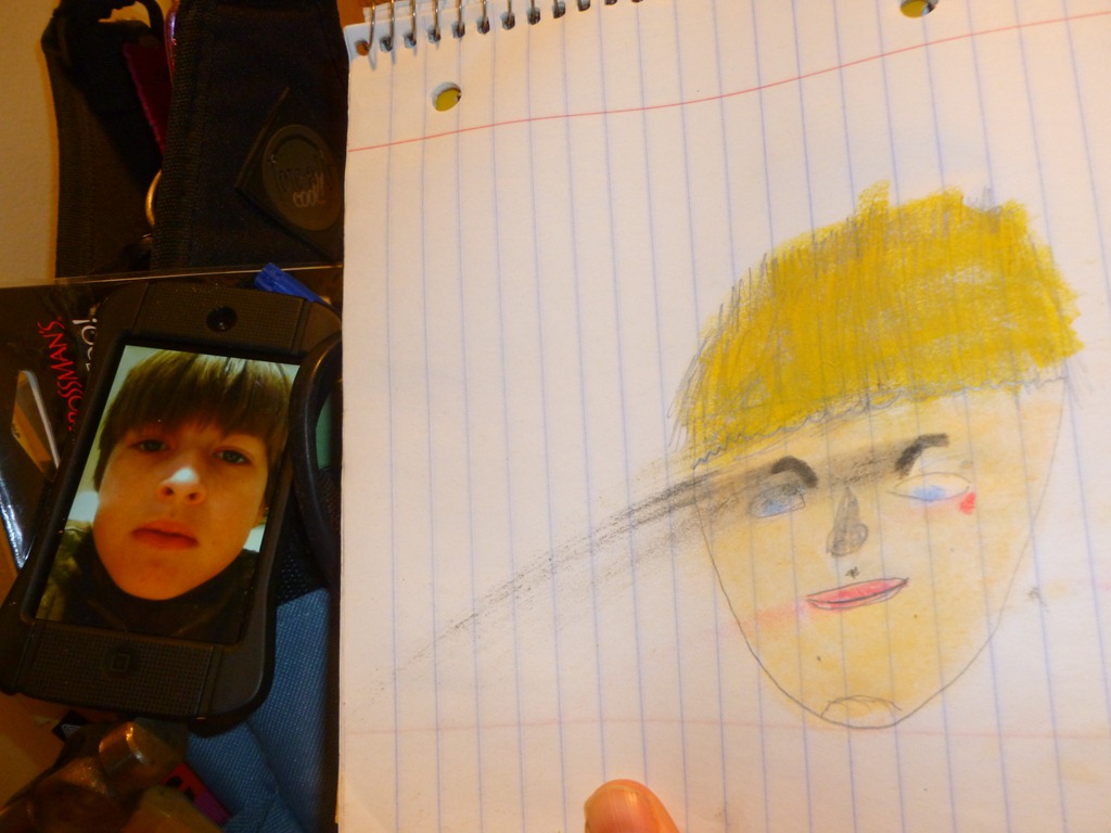 While he was busy working on his notebook page, Jon and I went out to the craft room to work on a self portrait. We didn’t have a mirror that would be easy to move, so Jon came up with the idea of using his iPod.  20th century folks.
