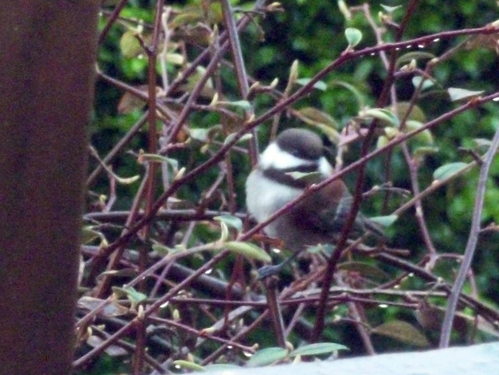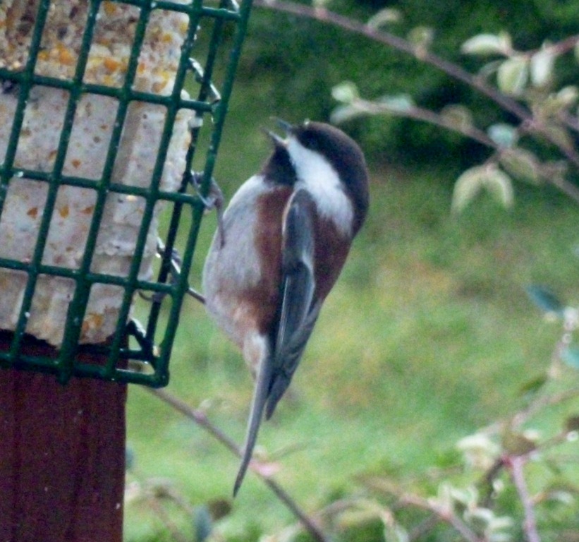 Went into the living room to find a large flock (15+) of Chestnut Backed Chickadees on the bush by the birdseed. I’ve seen 2-3 chickadees on the tree above the house, but never on the deck!