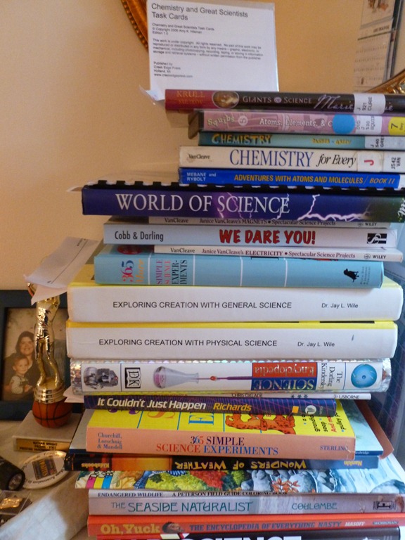 They have Science, History, Geography, Culture, Art, Music and Grammar Reinforcement Task cards.  She offers a large list of book ideas to use.  I went through the library to glean quite a few, and then to the used books store to pick up a few more.  I never dreamed that we would be able to learn Chemistry in the same way we were doing our other CM studies.