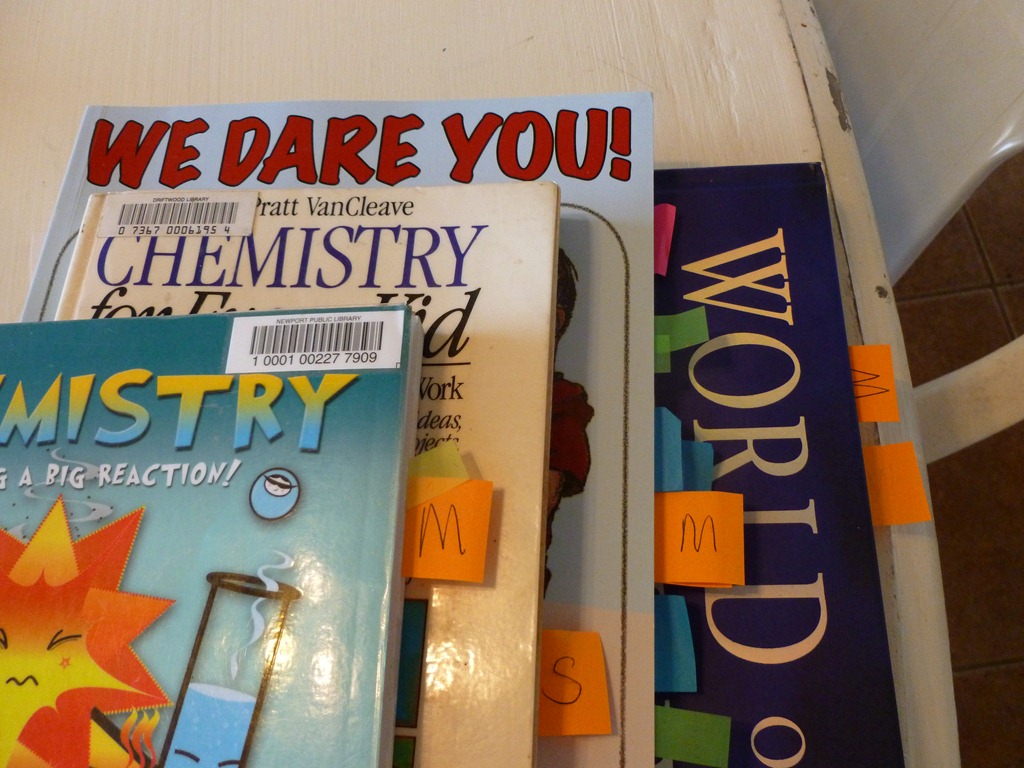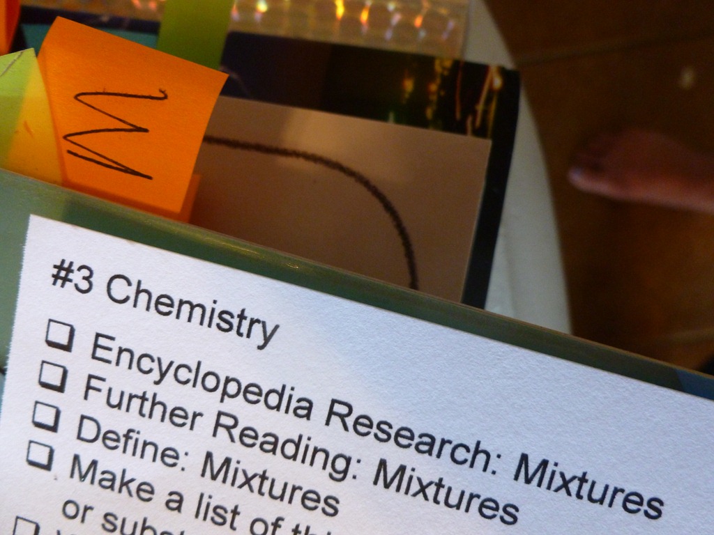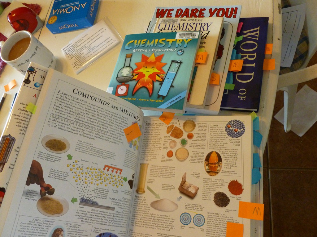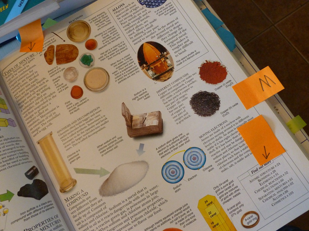 Second Task Card is Mixtures.  I had a bit of time in the morning, so I looked up Mixtures and Solutions and the other task points in a few books – marked them for Nate.  He really liked the tabs in his books.  Chemistry has become one of our favorite times of the week. And we do it the same way as Art, Composers, Geography and Nature.