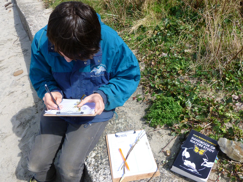 Nate worked on his notebooking pages at the beach, then came home to look up the bushes in our Northwest Native Plants book. He thinks that they are Hooker’s Willow.