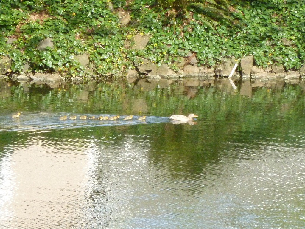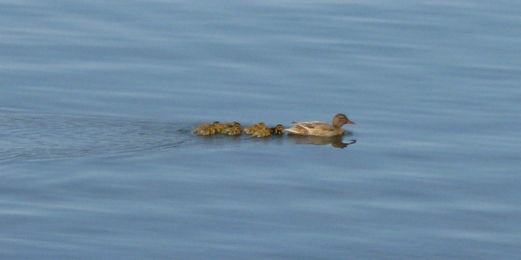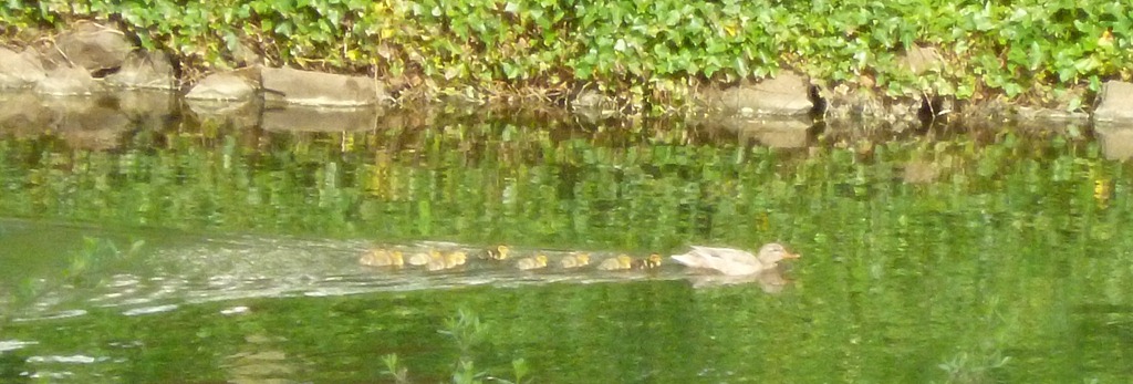 Goldie swam by with her second year of chicks!  She brought them right up to our dock for Jon to see, then dad told her to swim away further.  I think I counted 9.