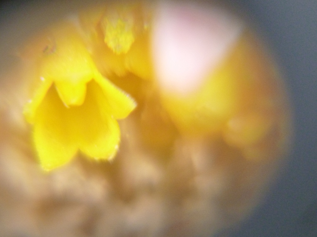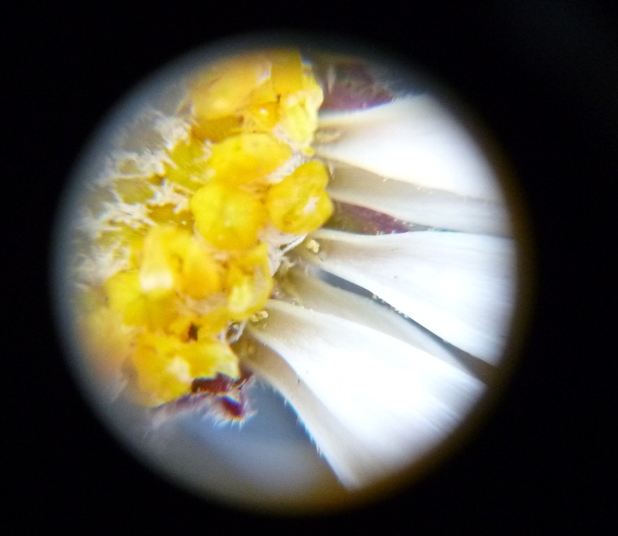 This little desert plant caught my eye in the parking area. Only a few tablespoons of rain are needed to get blooms going out here! ; I had my handy field microscope – the Discovery Scope – in my car, so I whipped it out, hunkered down in the sand, and spent a few minutes playing with it.