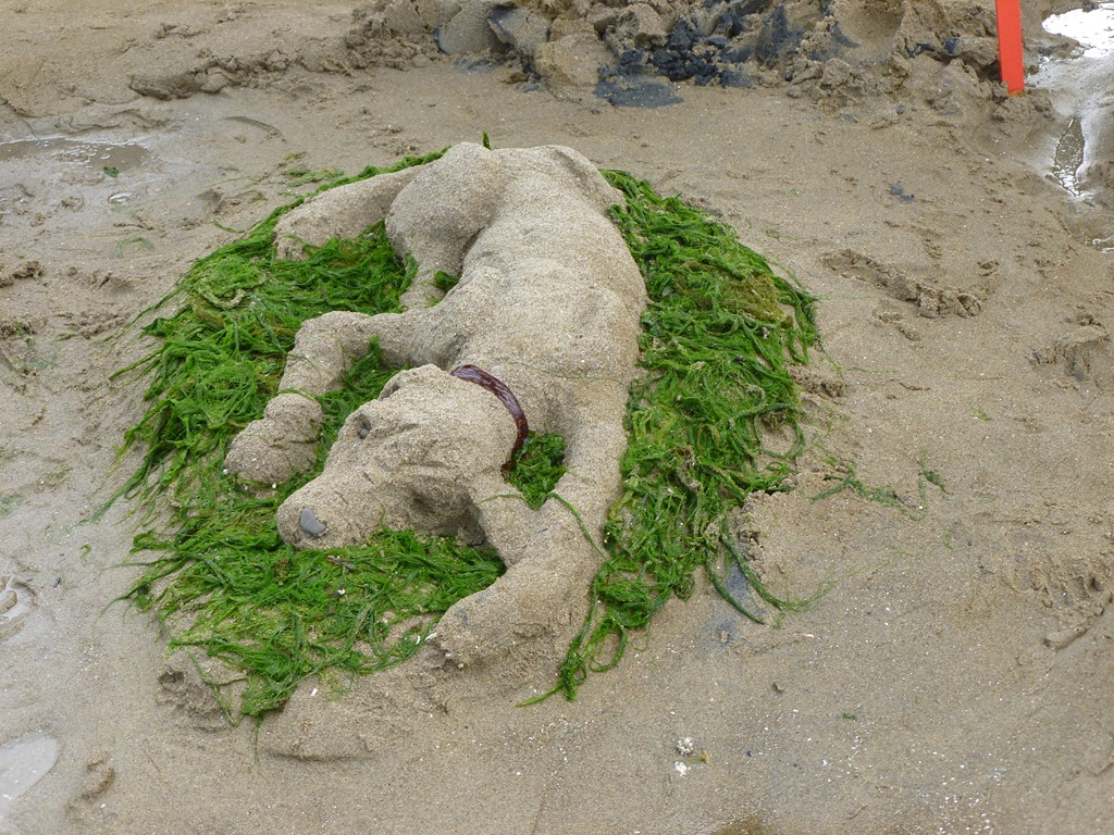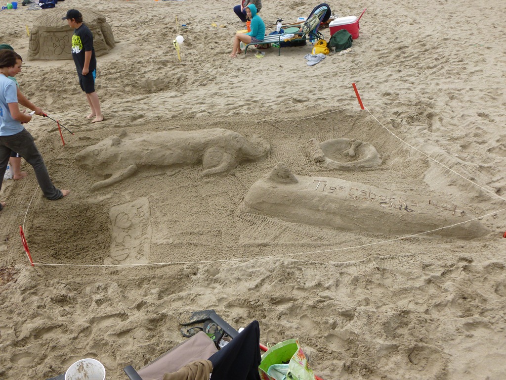 We had a great time on the beach in Taft today – as the DJ loves to say – It’s better at the beach! For a donation to the local food bank, we get to stake out a space of ground, hunker down for the day, and be participants instead of just spectators. we wanted to build up this year, so we dug. And Dug. And dug. And then. We dug some more. We dug from 10:30ish until 2ish. It doesn’t look like it, you’d think we’d have built a 3 story building!  Our entry was in the Dog category. We wanted a dog on a surf board, but ended up with a dog near a surf board. This category was sponsored by our friends at the Looking Glass Inn. We LOVE their prices, rooms, location, and love for dogs!  Thanks Looking Glass Inn!