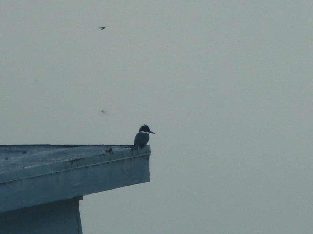 See the tiny dot on the edge of the boat house?  Kingfisher. He’s so cute. We have quite  few of them this year. Usually 1-2 at a time, yesterday I counted over 6 with many in the air. Cool. (Barn Swallow in the fuzzy flight)