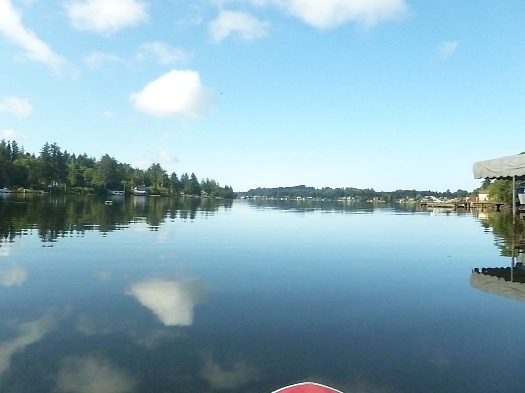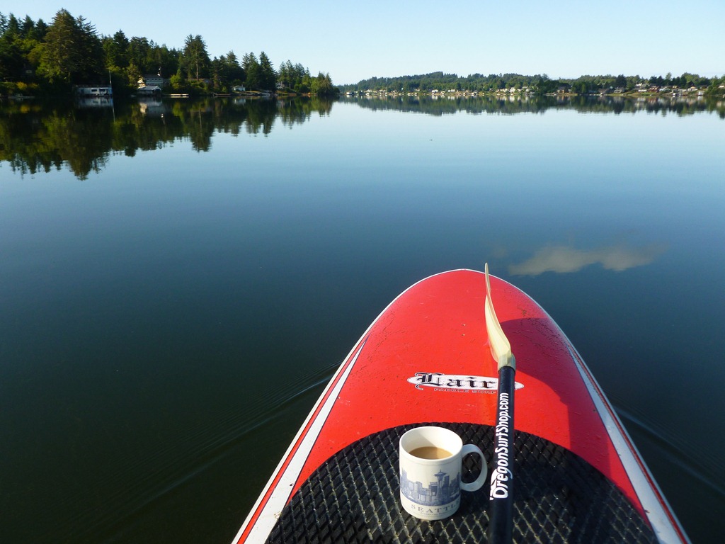 I went out this morning for a couple of miles on the lake – incredible. Headed east on the way home, glad for my baseball cap – the sun was SO warm and bright – the lake a mirror, I cranked up my iPod and had an excellent workout! Stowed the SUP on the beach by the house, ran up the stairs for my coffee, and paddled out a ways to sit and have coffee on the still mirror lake.