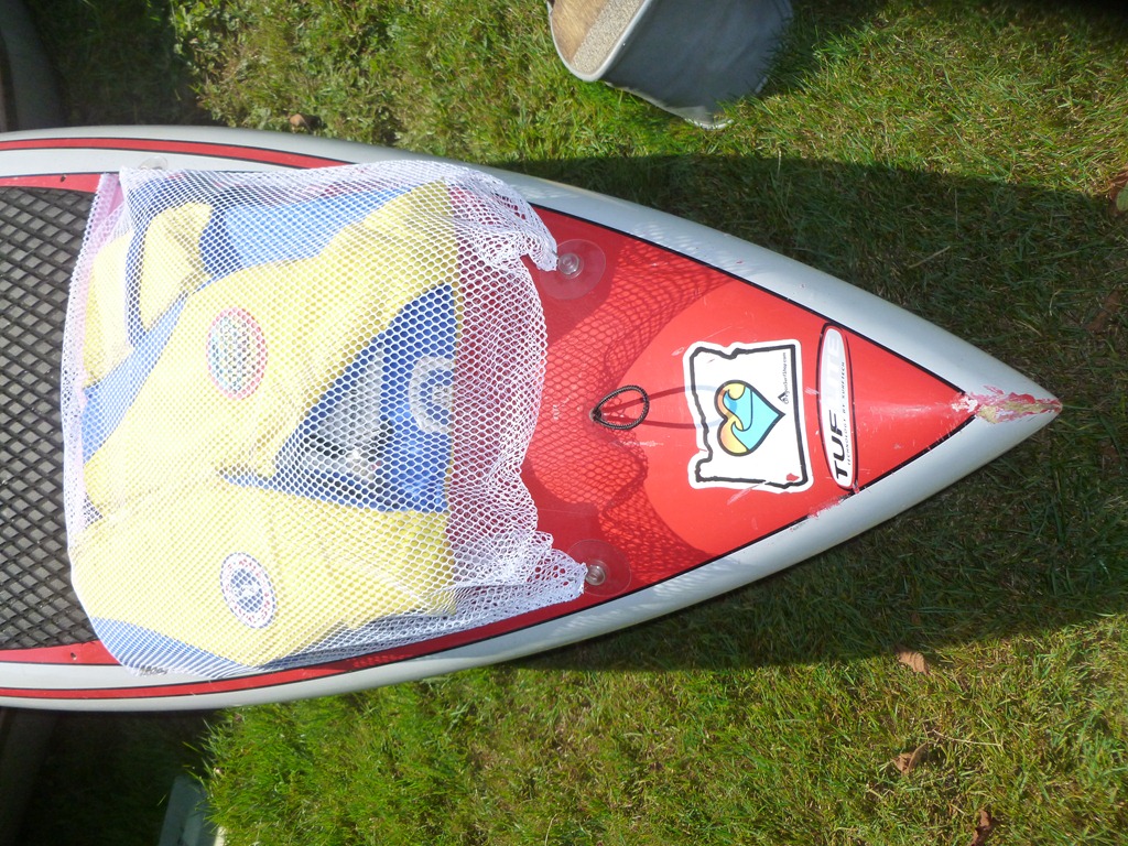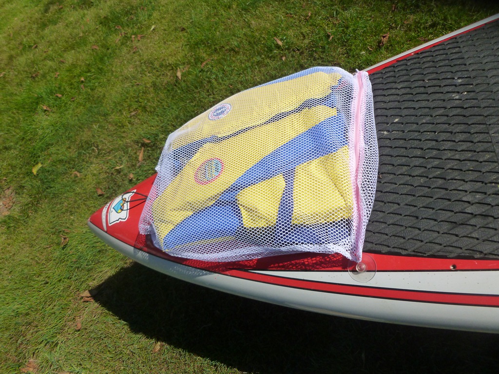 I went to my local mart – and found a laundry bag, then to the plumbing section and found suction cups. I went to the fishing section to see if the bag was big enough – It Was! So home gain, filled up the bags, took a tool to squeeze the hooks closed, and presto! My Life Jacket can stay on the top of a SUP board! I also like these bags for the canoe – I can just throw one in.