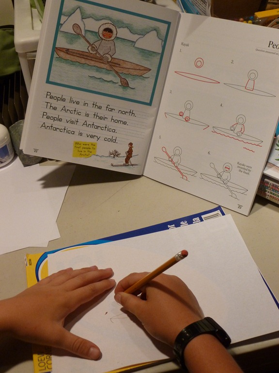 P1100249We used the Draw Write Now sets in the library – to help us illustrate our narrations.  Giving us ideas on how to create boats, polar bears, trains, and horses with our pencils.  The landscapes had more detail, the feathering and drawing more fine tuned.  More items seemed to be added to the backgrounds.  Birds were sketched in more physical positions.  Jon is constantly asking – What should I draw?  I usually pull out the book and we work on creating a better swan, or cat, or horse. Oh – I almost forgot, each book is a themed unit study!
