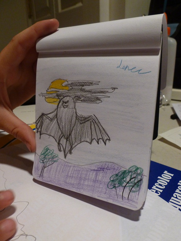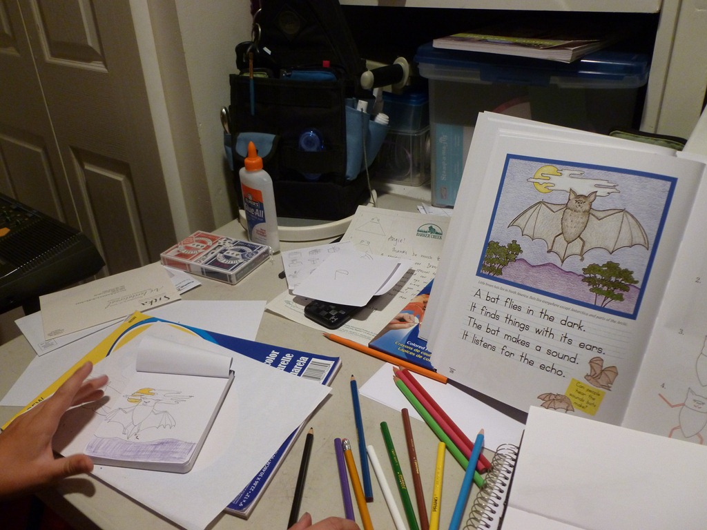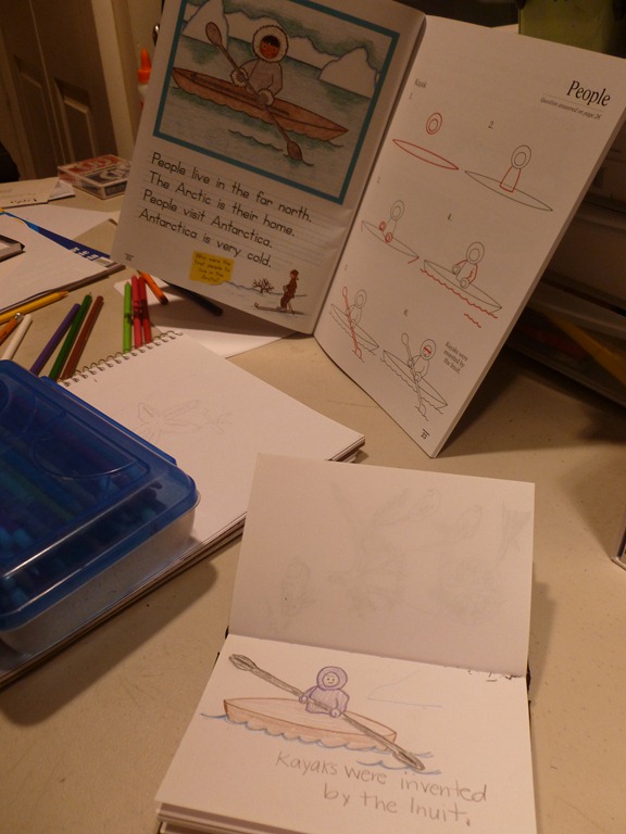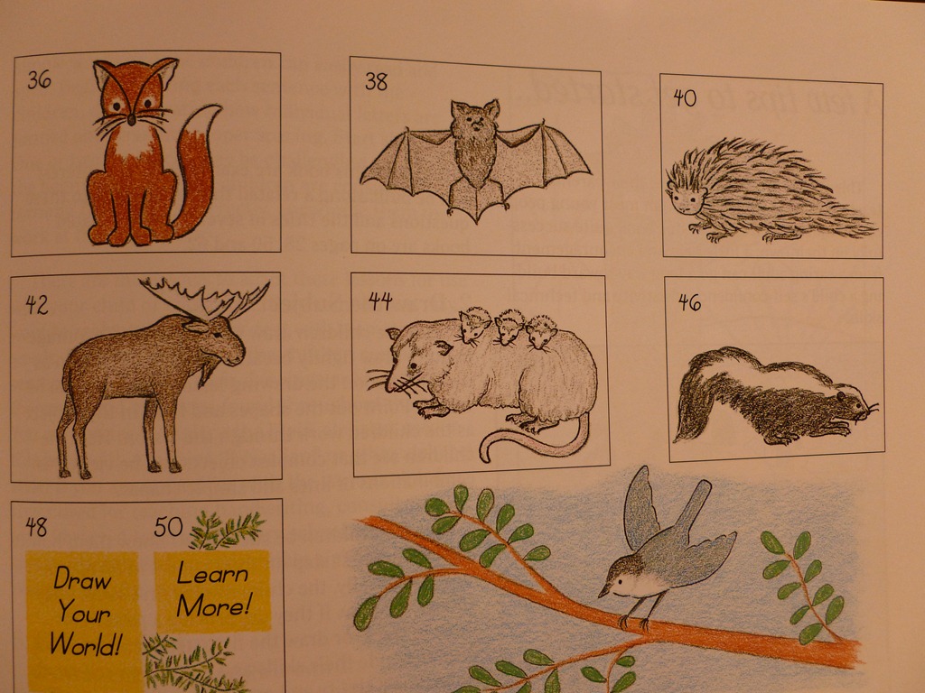 I felt a little bad, that now, in the 6th and 9th grades, we would finally have a complete set for our use, when the boys are so much older.  I really shouldn’t have worried. Jon immediately opened the set and turned the kitchen table into a craft center.  He dug through the images of each book, creating bears, people, shrimp, shells, and birds. Nate is still not a big sketcher, he may never be – and honestly – he has not used them, but – visiting friends, with older kids – have enjoyed using these books as well.