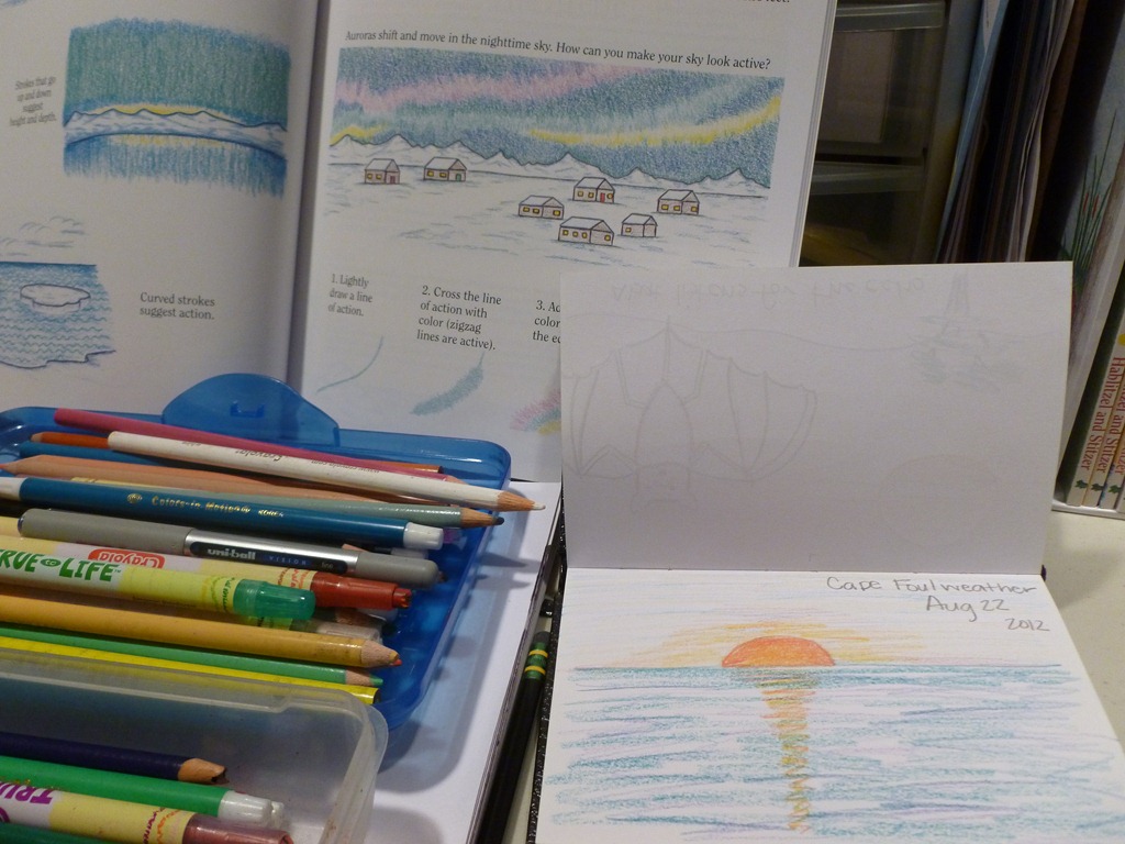 P1100243P1100244 The pages have art suggestions of how to use the direction of strokes from the colored pencils to help give texture to the picture. how to blend the colors. How to show perspective.  It may not be a High School Credit for Art – but does all art need to be hard and arduous to be learning and practicing creativity?  It is still on my using shelf this year.