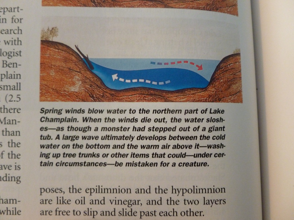 For the lake mentioned in this article – it had to do with the warm winds blowing over the tops of the cold water. “The wave ultimately develops between the cold water on the bottom and the warm water air above it.” We marveled that a huge tree trunk washed up on our beach this year lodging itself under the boat dock. The paragraph continues – “washing up tree trunks or other items that could, under certain circumstances – be mistaken for a creature”