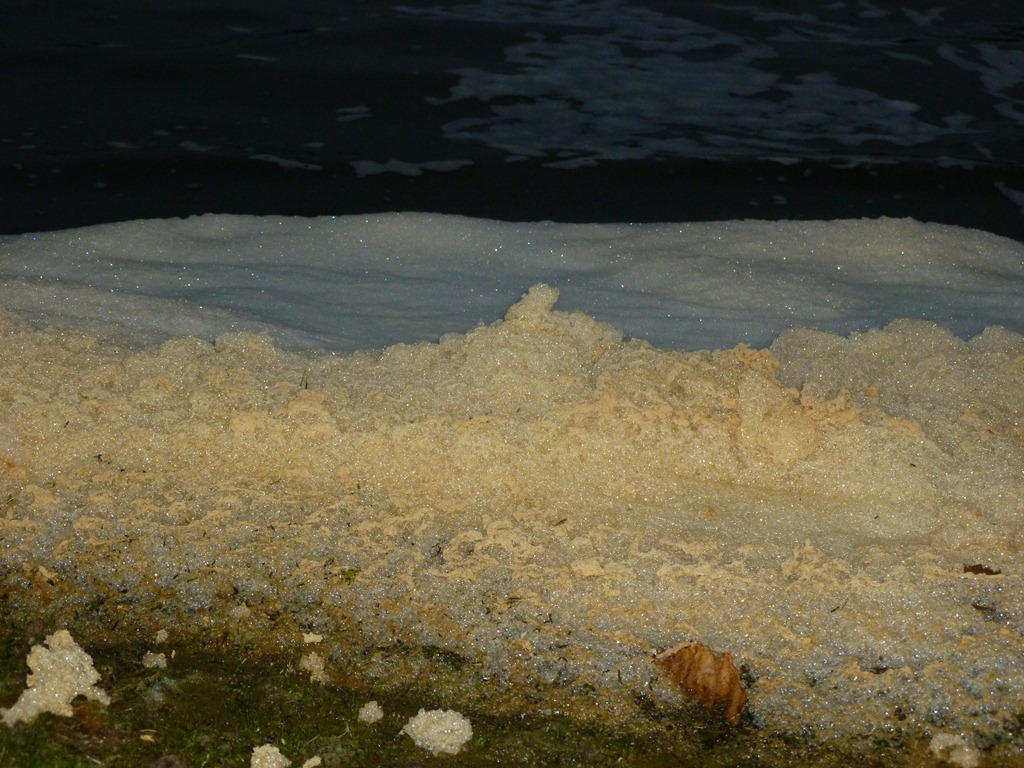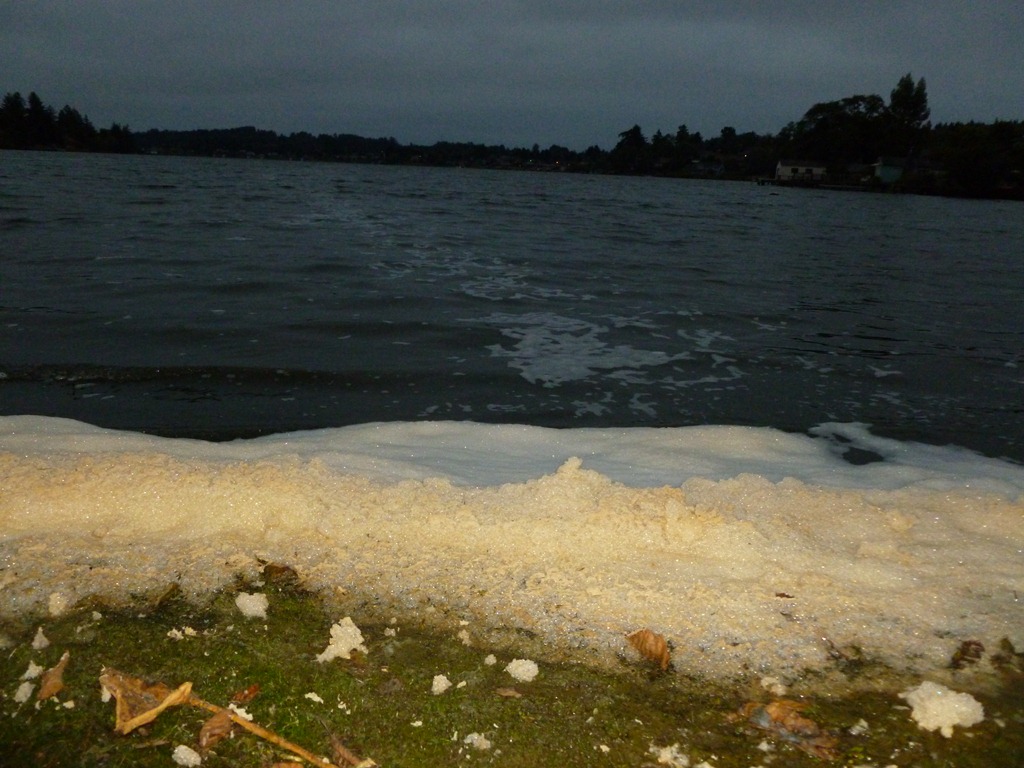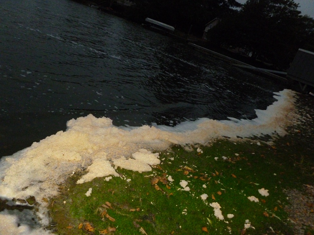 The wind blows on the surface area of the water, currents mix with the air and agitate the dying algae and plants in the lake, creating this foam. We see it at the beach as well. The good news – the algae is dying. The bad news? This stuff dries up and is Really Stinky. Like dead fish. Yuck.