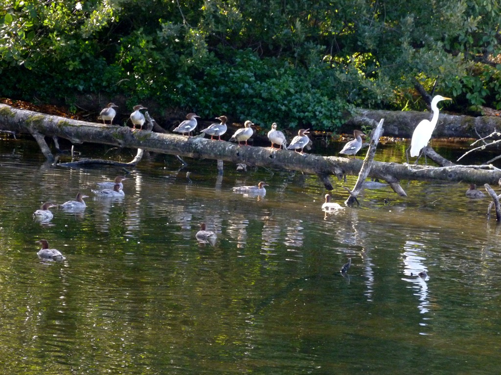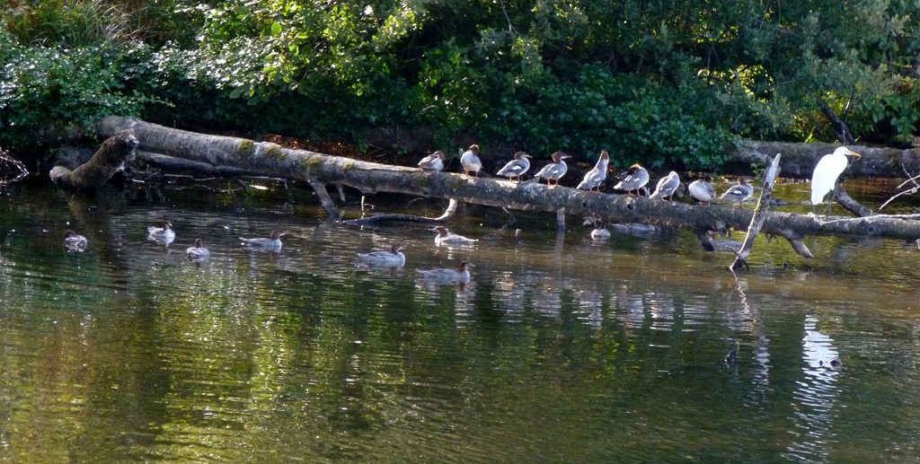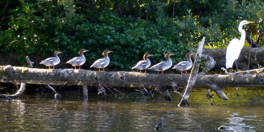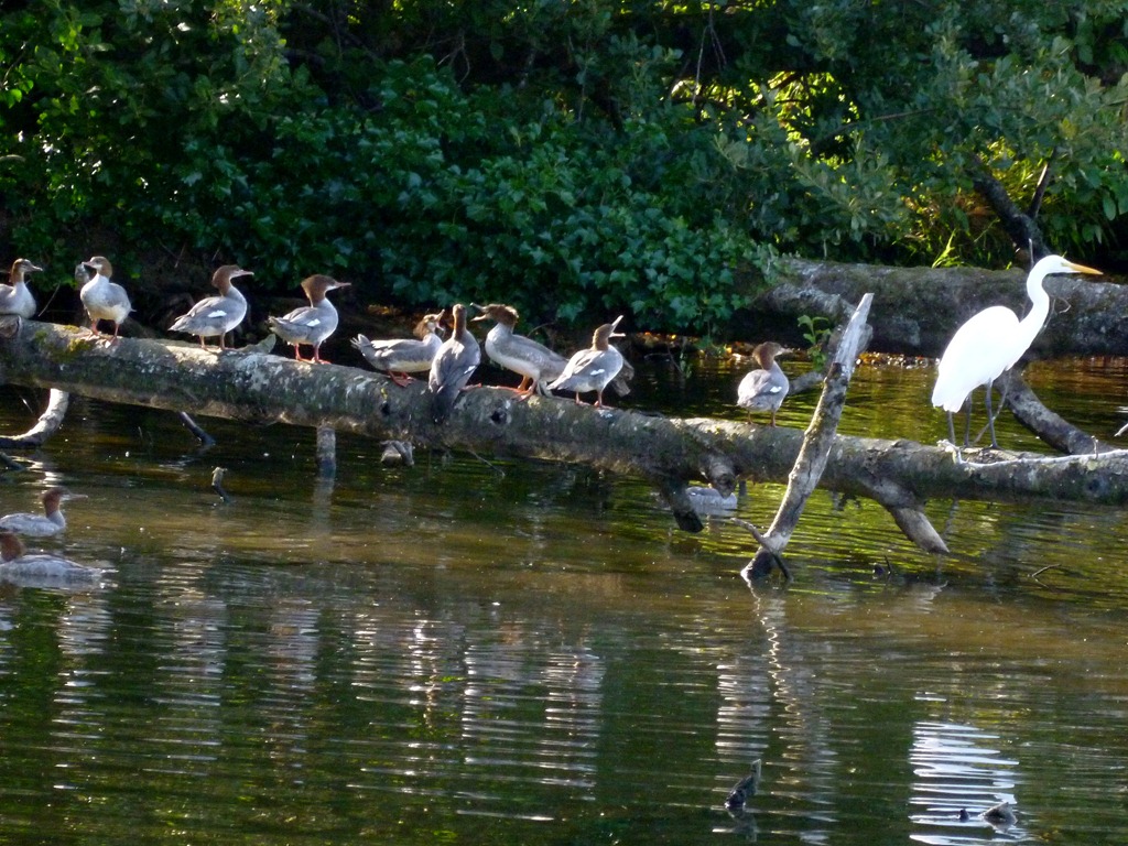 I walked down because I saw 4-5 Mergansers swim over to the spot next door.  I am getting a lot better at self control with physical excitement because I came around the corner of the boat house and saw this scene, and didn’t scare them away.